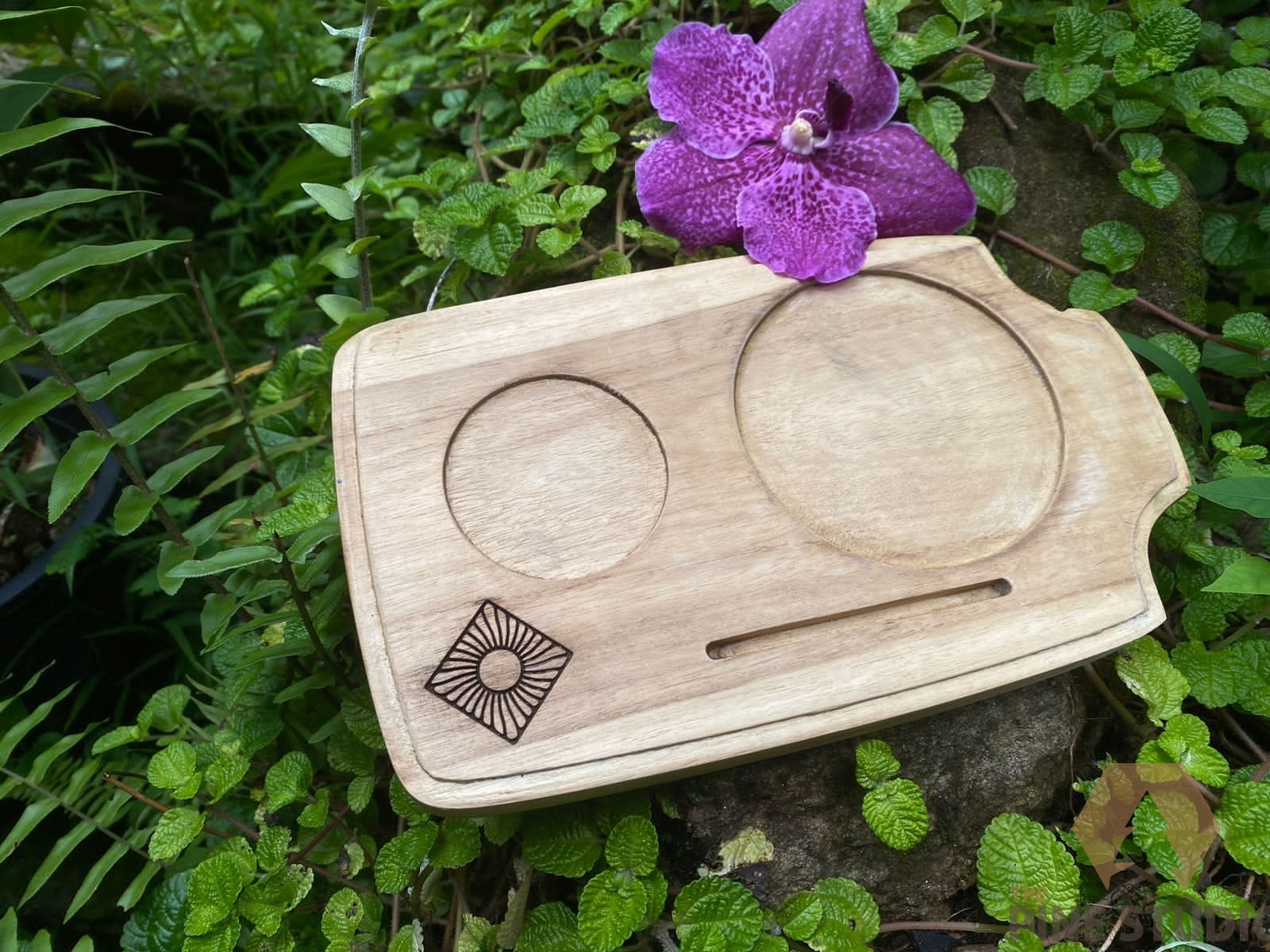 Coffee Platter Board made using Bleached Teak with a menu card, two cup holder and logo laser engraved. Need one made like this? Call/Whatsapp 077 5030962